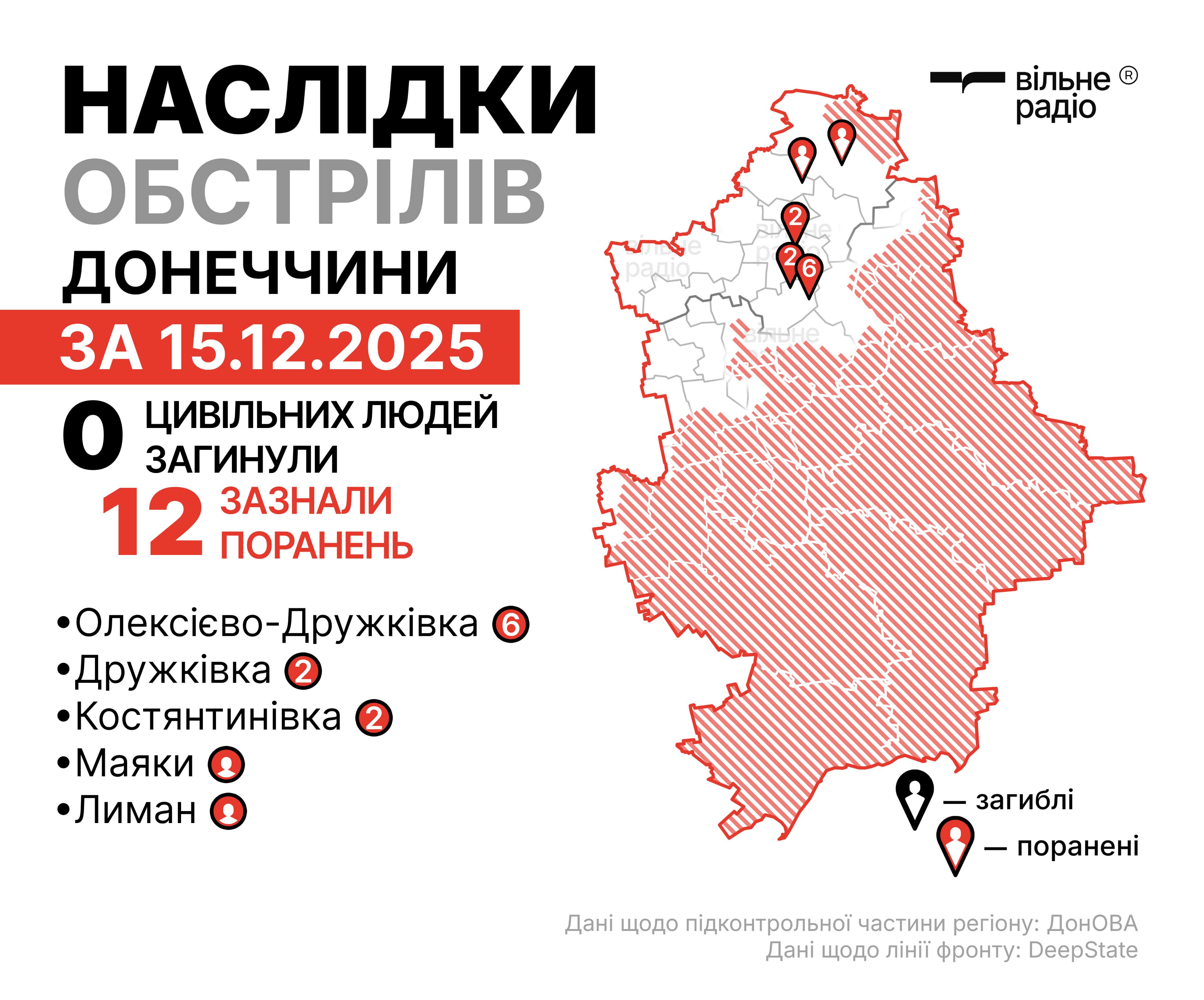 Наслідки російських атак у Донецькій області за 15 грудня 2025 року. Інфографіка: Вільне РадіоНаслідки російських атак у Донецькій області за 15 грудня 2025 року. Фото: ГУНП ДонеччиниНаслідки російських атак у Донецькій області за 15 грудня 2025 року. Фото: ГУНП Донеччини