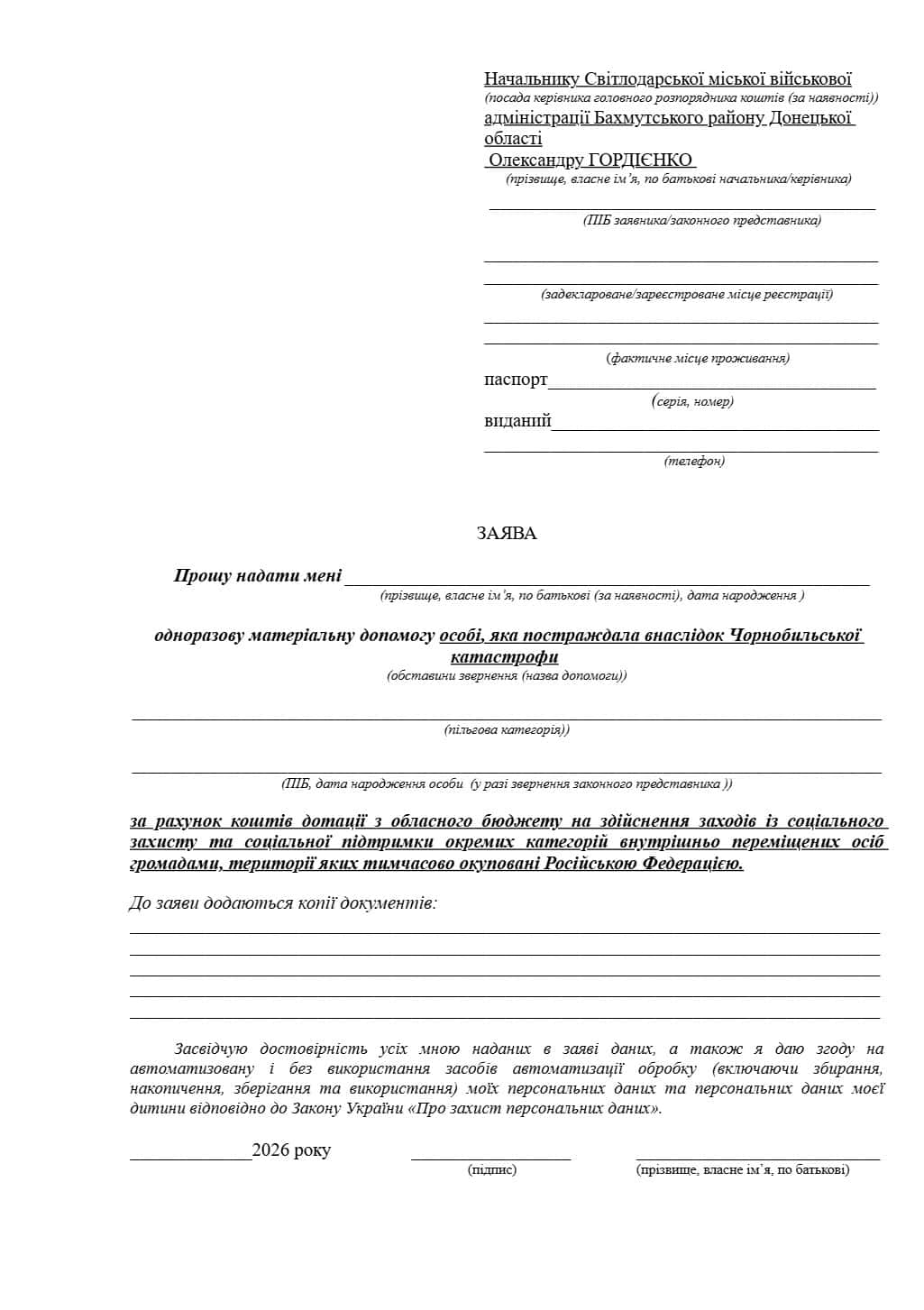 Для оформлення допомоги заявник подає особисту заяву (приклад є нижче) разом із наступним пакетом документів:
