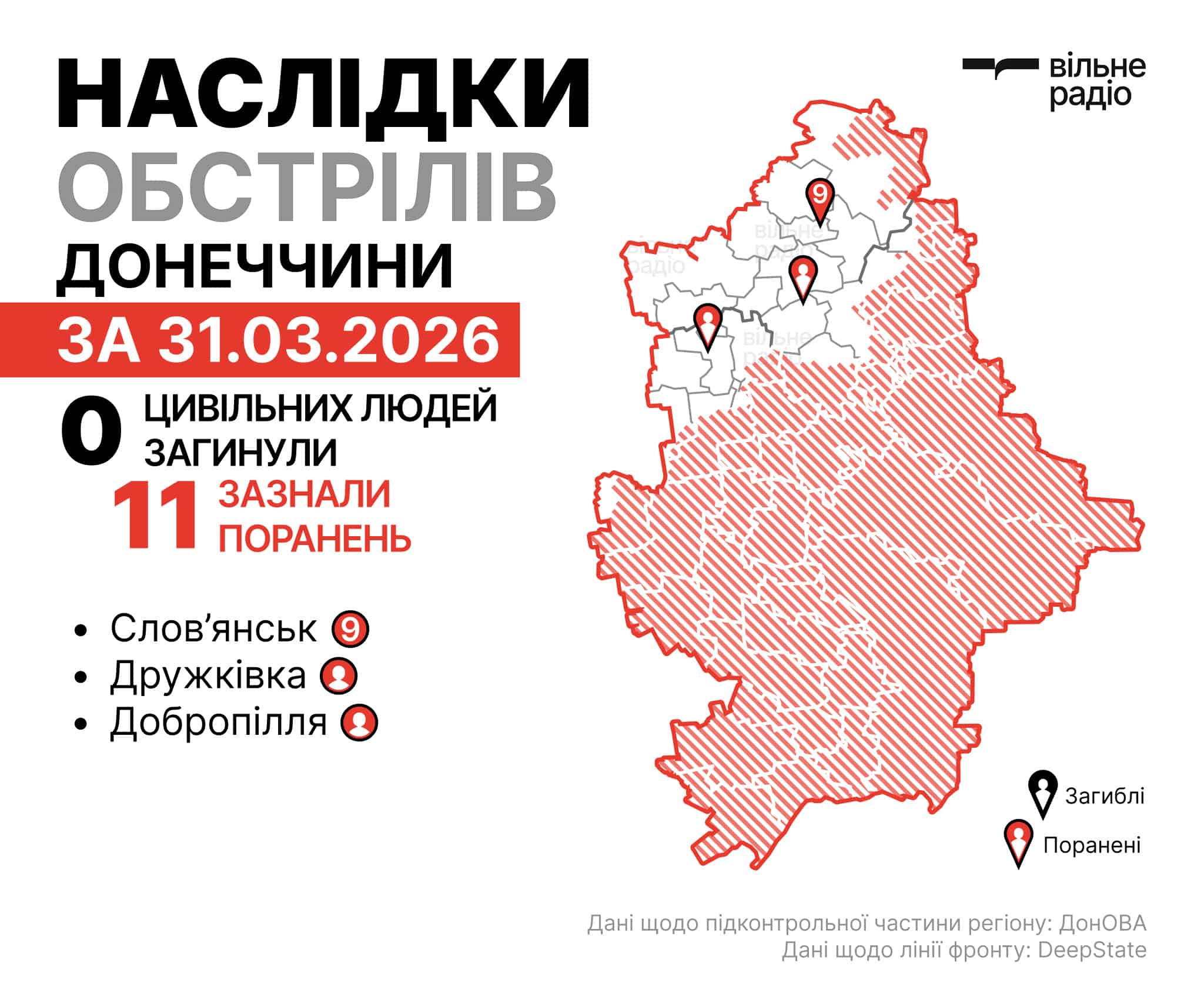 Жертви російських атак у Донецькій області за 31 березня 2026-го. Інфографіка: Вільне РадіоНаслідки російських атак у Донецькій області за 31 березня 2026 року. Фото: ГУНП ДонеччиниНаслідки російських атак у Донецькій області за 31 березня 2026 року. Фото: ГУНП ДонеччиниНаслідки російських атак у Донецькій області за 31 березня 2026 року. Фото: ГУНП Донеччини