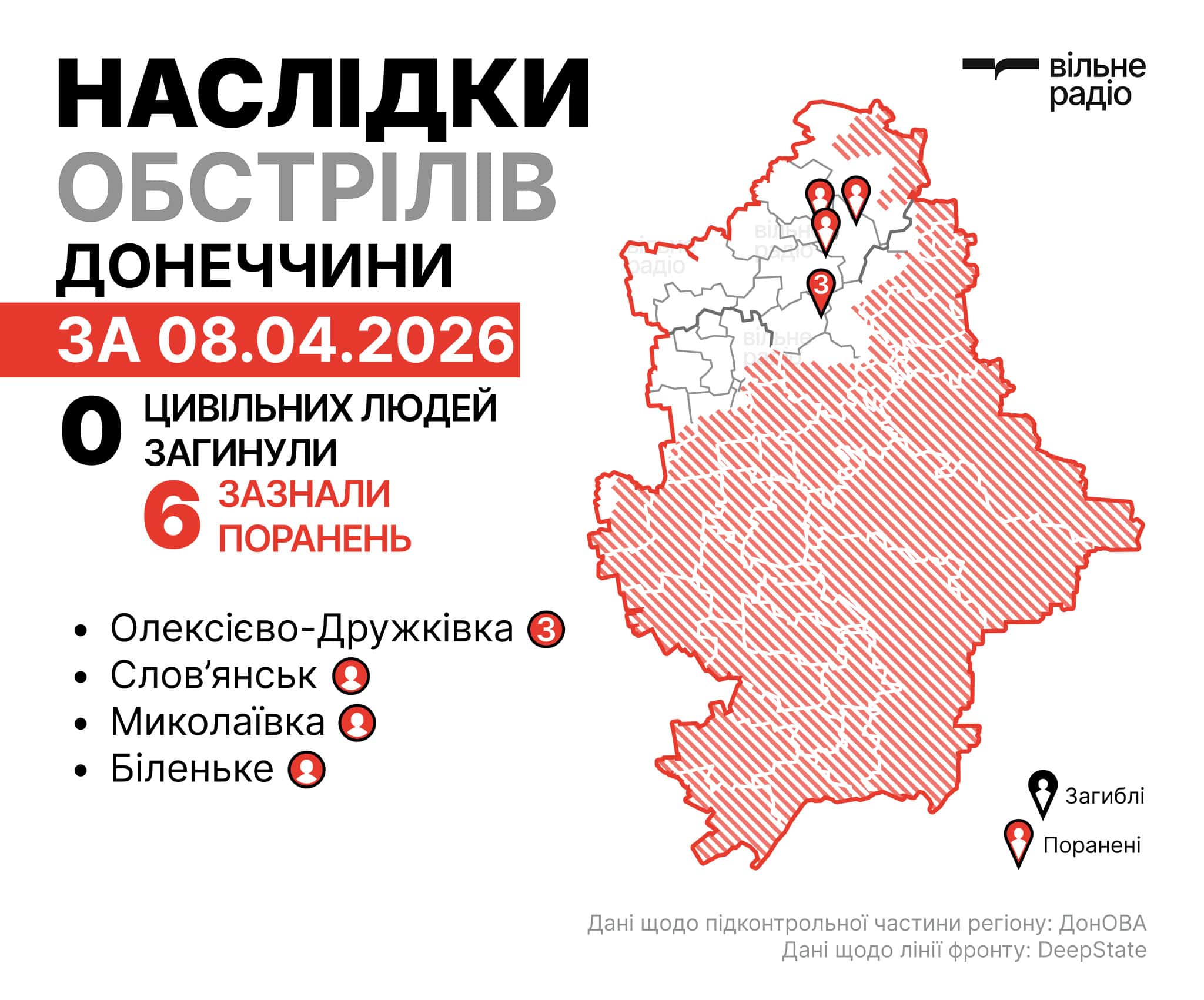 Міста Добропілля, Дружківка, Краматорськ, Миколаївка та Слов’янськ, селища Біленьке, Малотаранівка, Олексієво-Дружківка, Райгородок та Шабельківка, — ці населені пункти були під вогнем 8 квітня, стверджують у поліції.