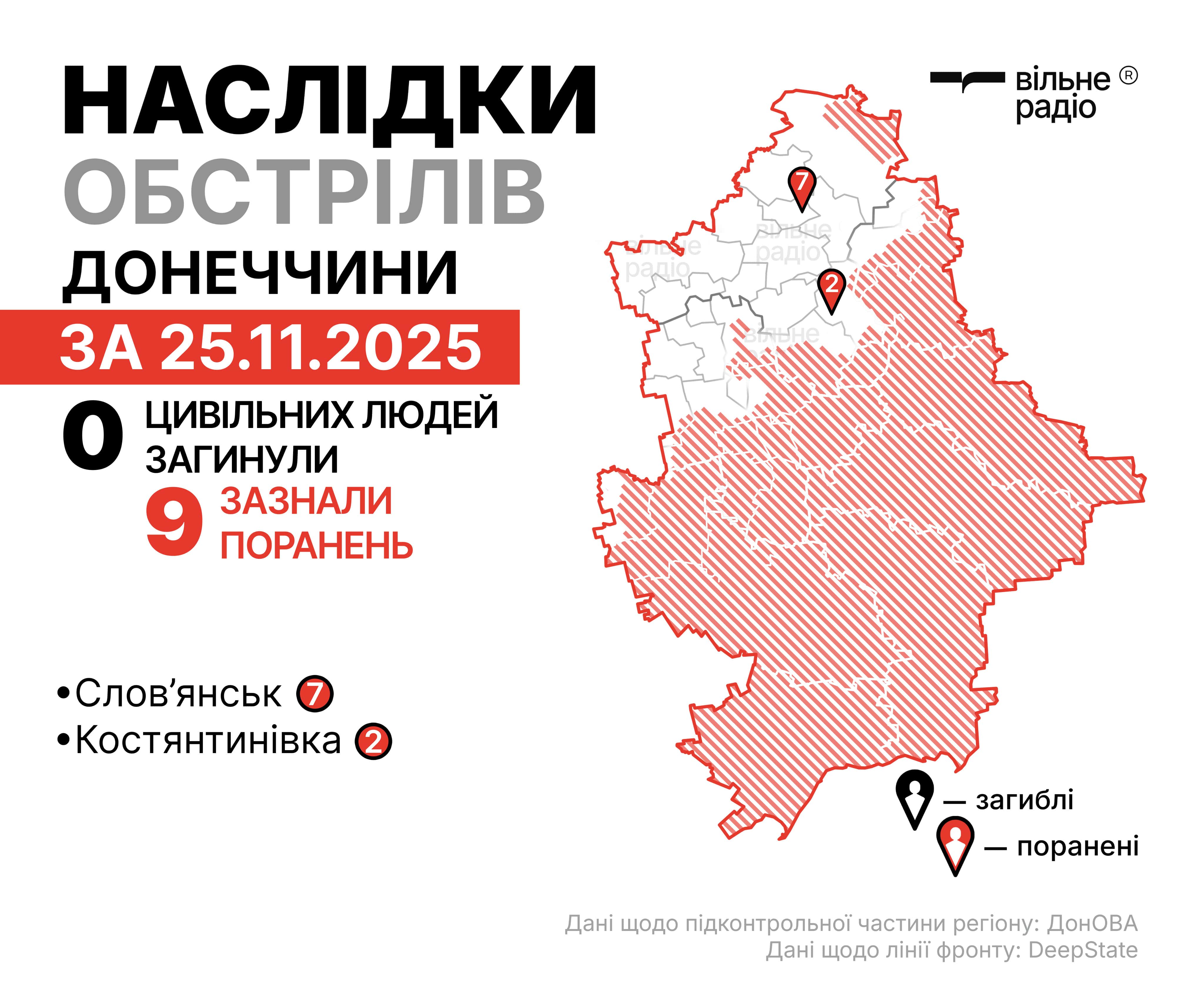 Протягом 25 листопада, згідно зі зведенням від поліції, росіяни били по містах Дружківка, Костянтинівка, Краматорськ, Лиман, Миколаївка та Слов’янськ, а також по селу Ганнівка. Для атак підіймали у повітря пілотовану авіацію, з якої скидали авіабомби, а також залучили артилерію й дрони.