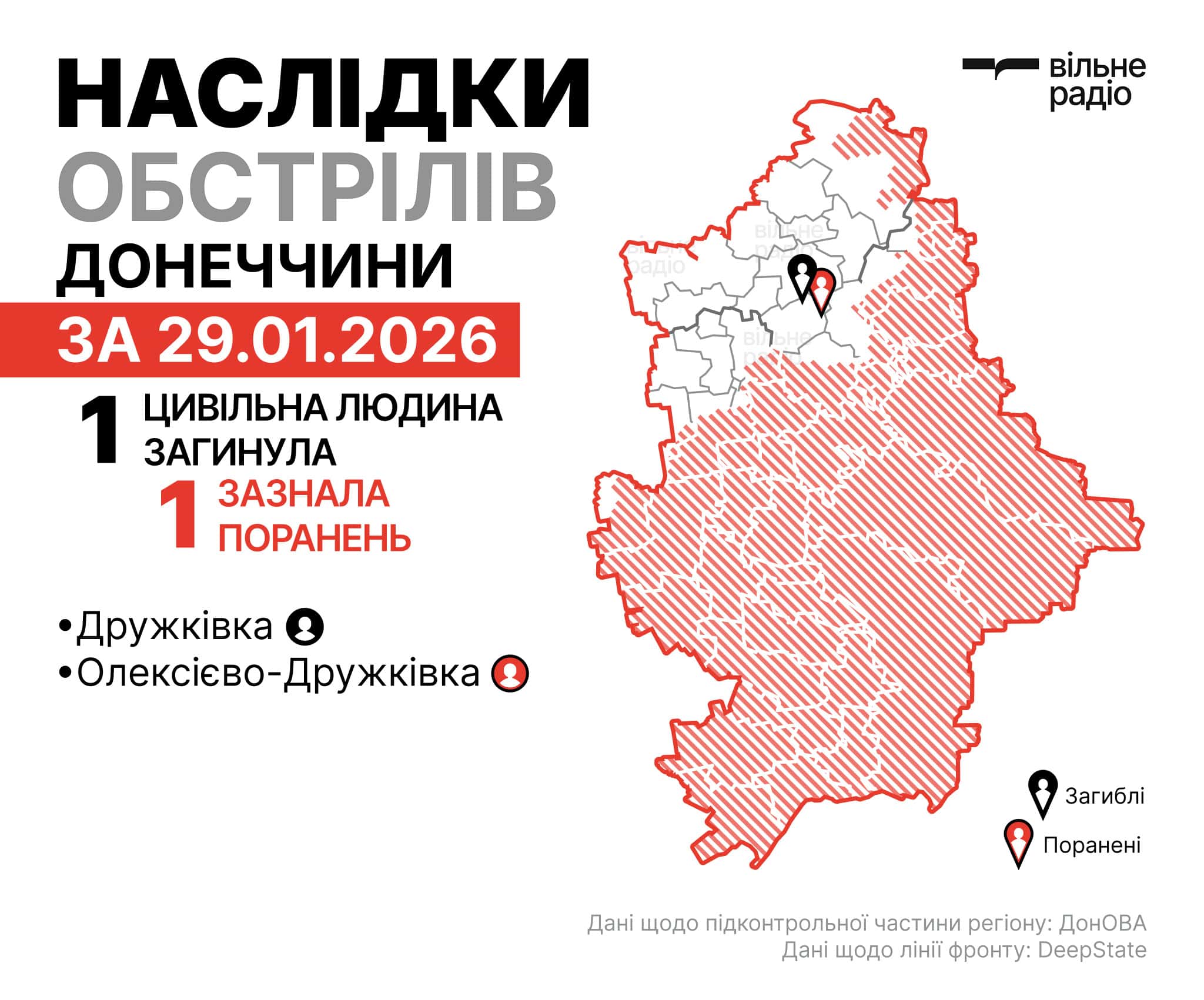 Наслідки російських атак у Донецькій області 29 січня 2026 року. Інфографіка: Вільне РадіоНаслідки російських атак у Донецькій області 29 січня 2026 року. Фото: поліція ДонеччиниНаслідки російських атак у Донецькій області 29 січня 2026 року. Фото: поліція Донеччини