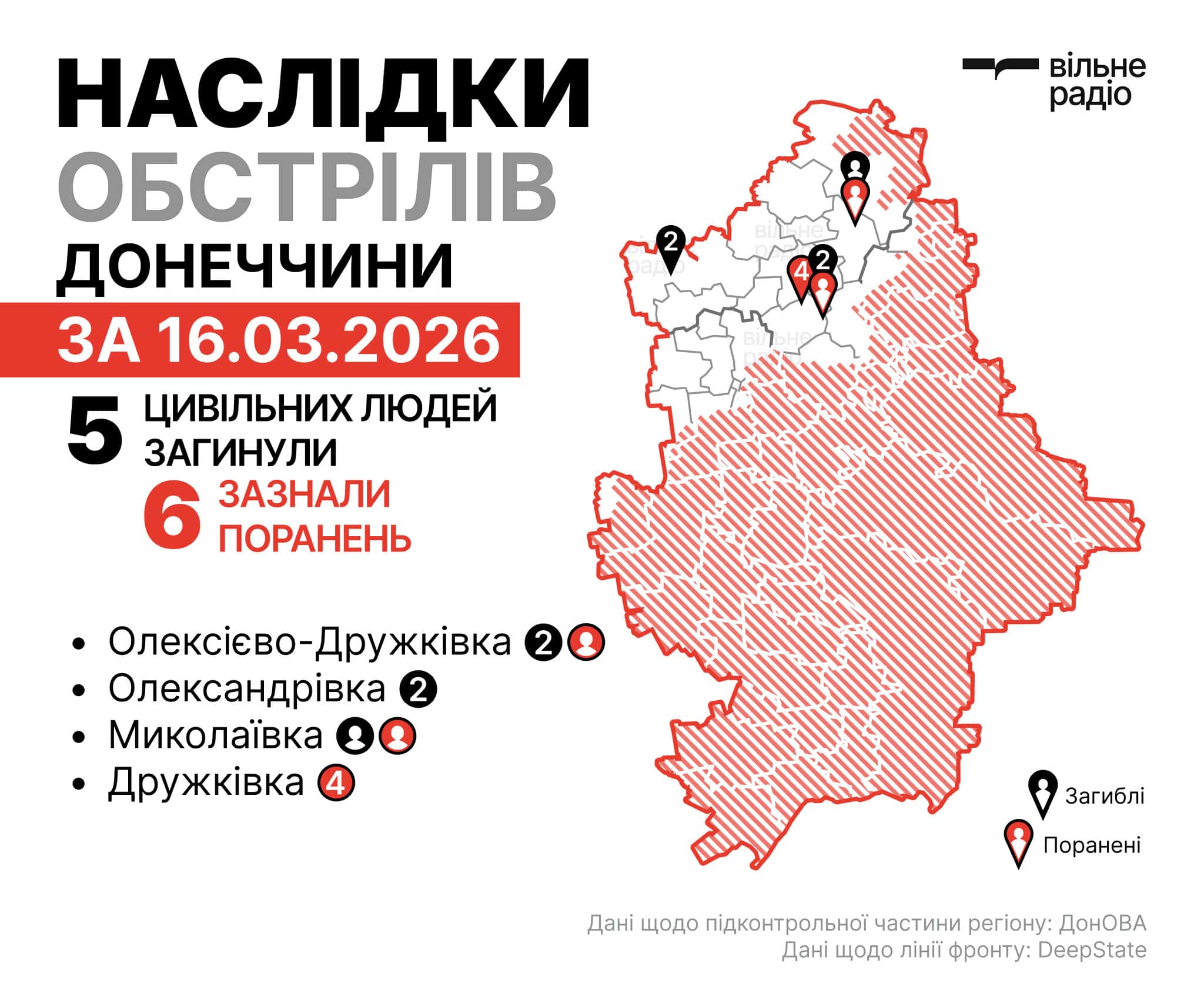 На підконтрольній частині Донецької області минула чергова доба під російськими обстрілами. Поліцейські зафіксували загалом 1 648 ударів армії країни-агресорки по лінії фронту та житлових кварталах області. Внаслідок цих атак загинули п’ятеро цивільних, ще шестеро — поранені.