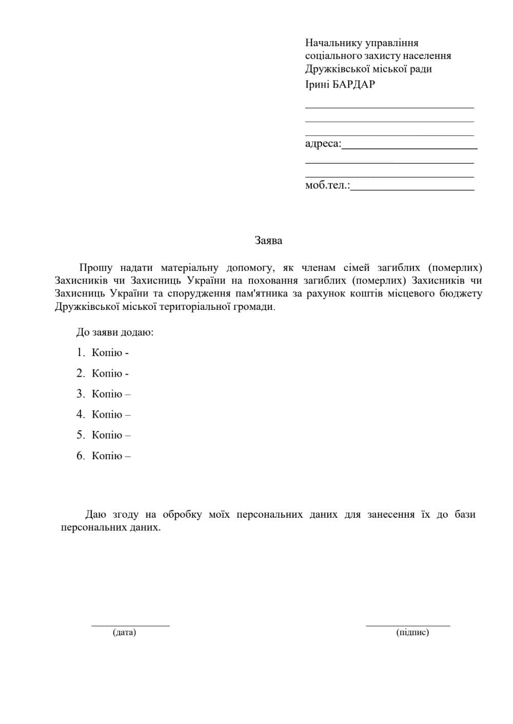 Для отримання одноразової допомоги розміром 50 тис. грн у 2026 році потрібно подати до управління соцзахисту населення Дружківської міськради заяву (приклад прикладаємо нижче) та такі документи: