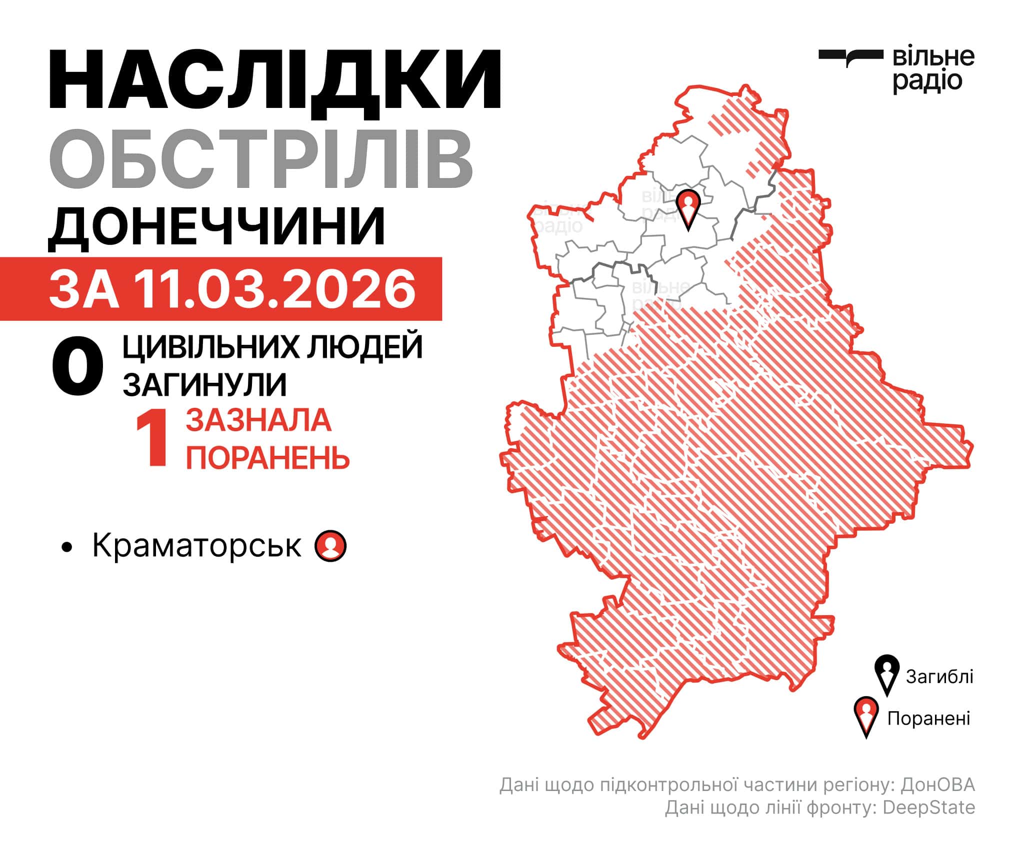 У зведенні поліція повідомляє, що 11 березня на Донеччині влучання фіксували у містах Дружківка, Краматорськ, Миколаївка та Слов’янськ, селищі Біленькому та селі Очеретиному. До переліку озброєння, яким били по підконтрольній частині регіону, входять дрони різних типів та авіабомби.