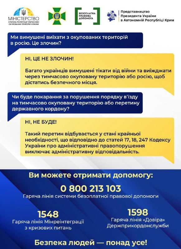 Также в сообщении указывается, что в любой ситуации граждане могут обратиться за разъяснениями на «горячую линию» Минреинтеграции по кризисным вопросам по номеру 1548 .