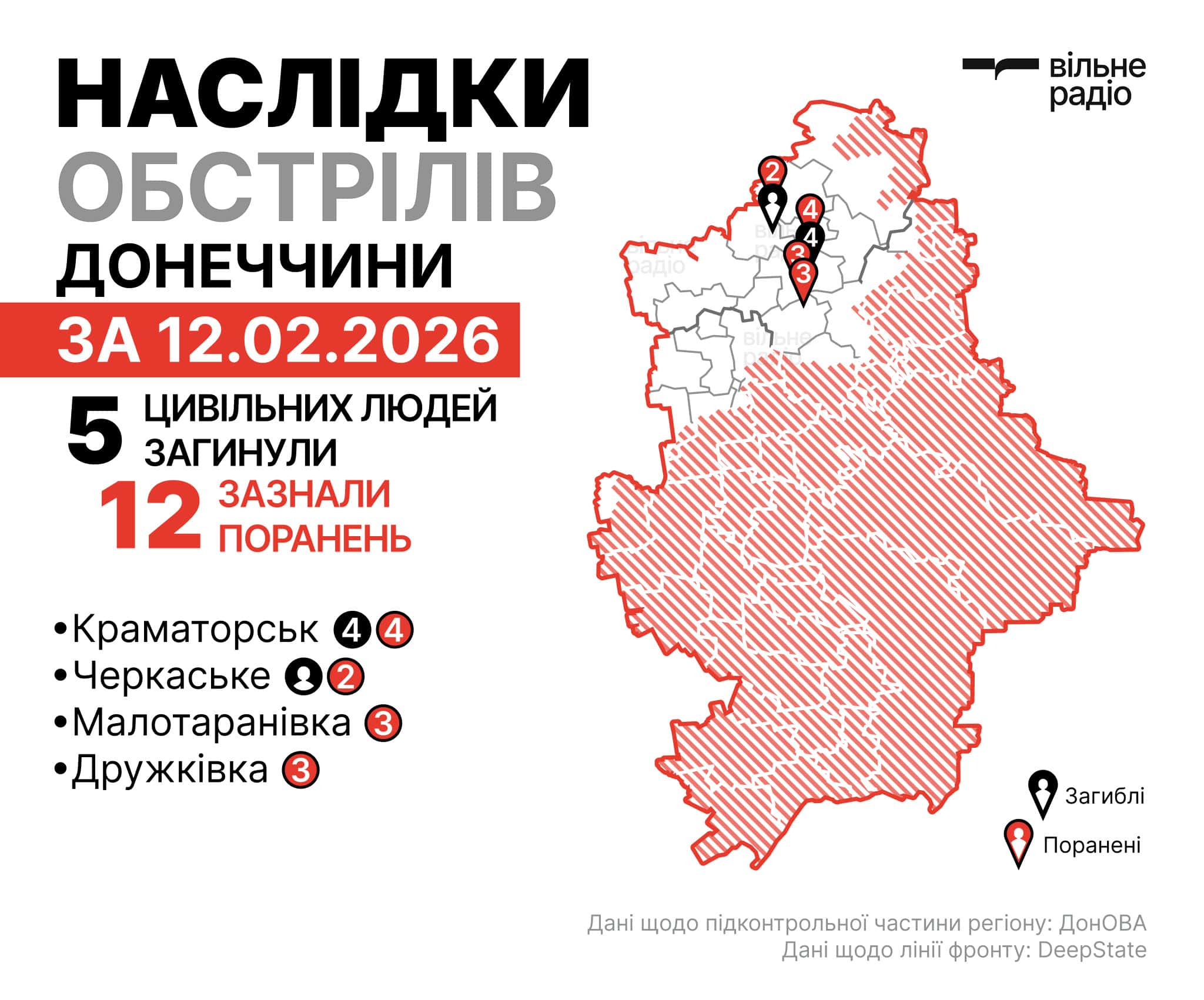 В течение 12 февраля полиция продолжала фиксировать российские удары из различных видов оружия по территории подконтрольной части Донецкой области, правоохранители насчитали всего 1 445 таких атак. Часть ударов пришлась по жилым кварталам региона, есть пятеро погибших гражданских. Большинство — в Краматорске, где, в частности, оборвалась жизнь мальчика 8 лет, двух его взрослых братьев и соседа.
