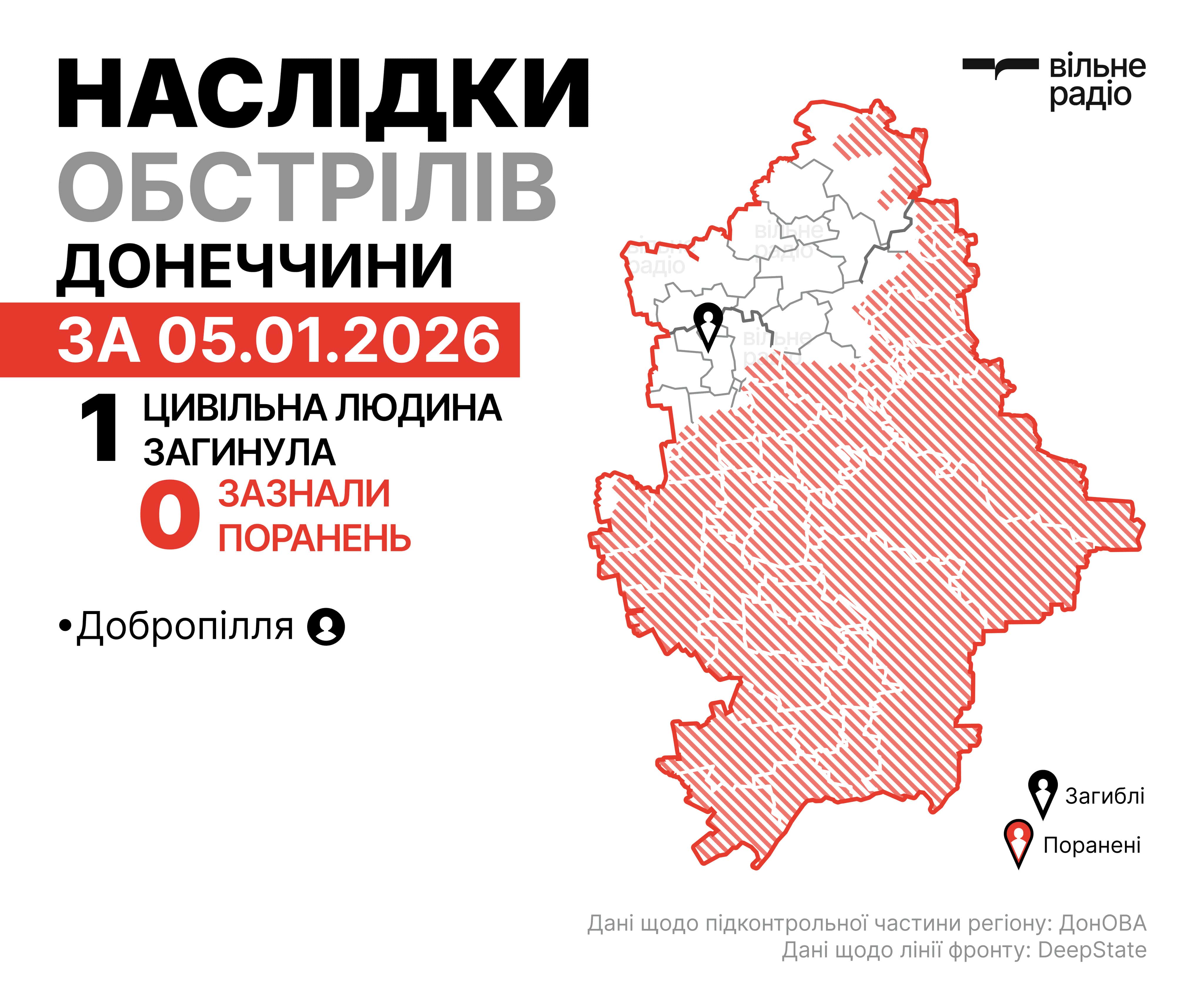 Ще 1592 удари по підконтрольній частині Донецької області зафіксувала поліція протягом доби 5 січня. Атаки були спрямовані не лише на лінію фронту, де триває російський наступ, а й по порівняно віддалених від боїв населених пунктах регіону. Не обійшлося без втрат серед цивільних, відомо про загибель людини в Добропіллі.