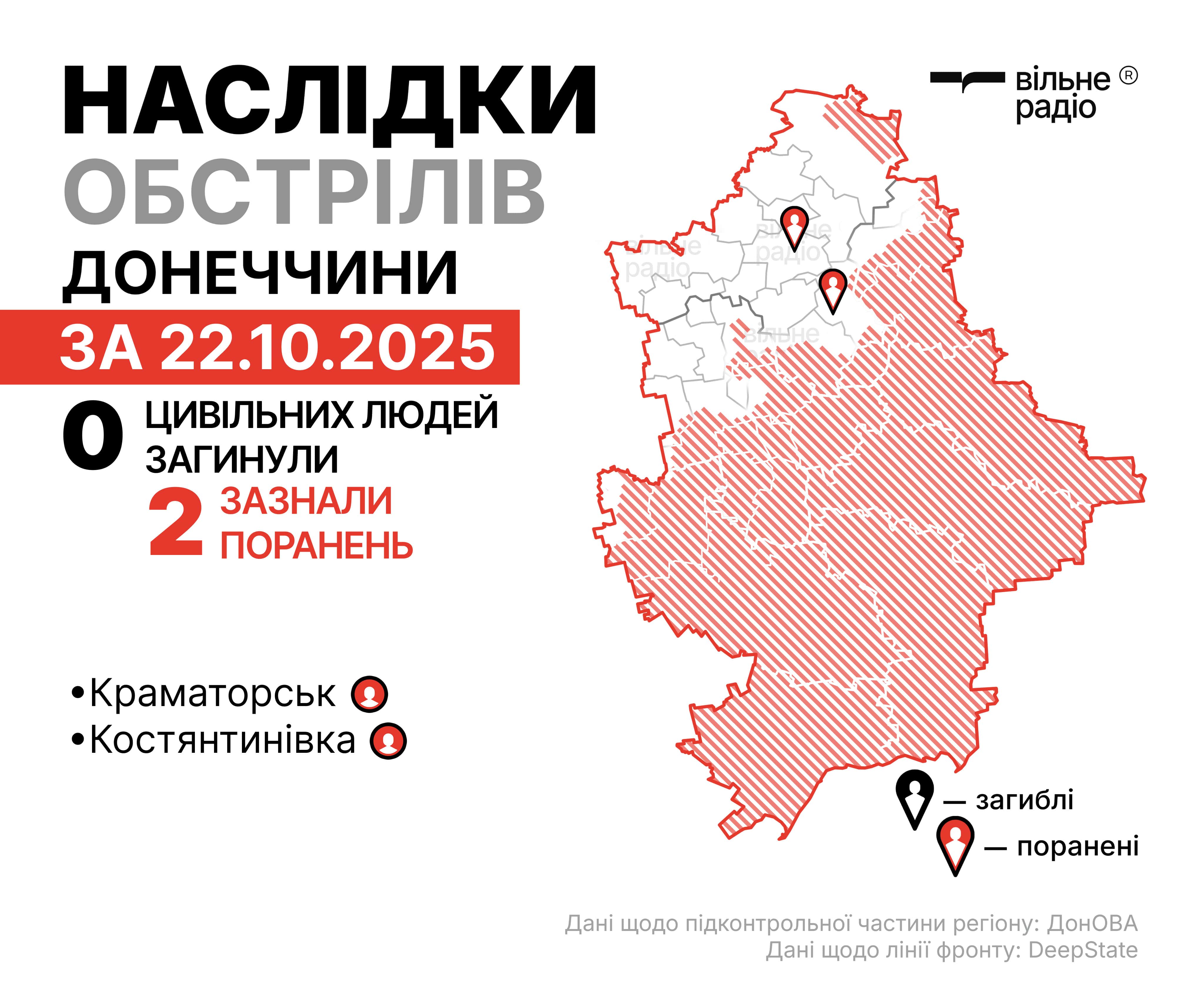 Наслідки російських атак у Донецькій області за 22 жовтня 2025 року. Інфографіка від Вільного РадіоНаслідки російських атак у Донецькій області за 22 жовтня 2025 року. Фото: поліція ДонеччиниНаслідки російських атак у Донецькій області за 22 жовтня 2025 року. Фото: поліція Донеччини