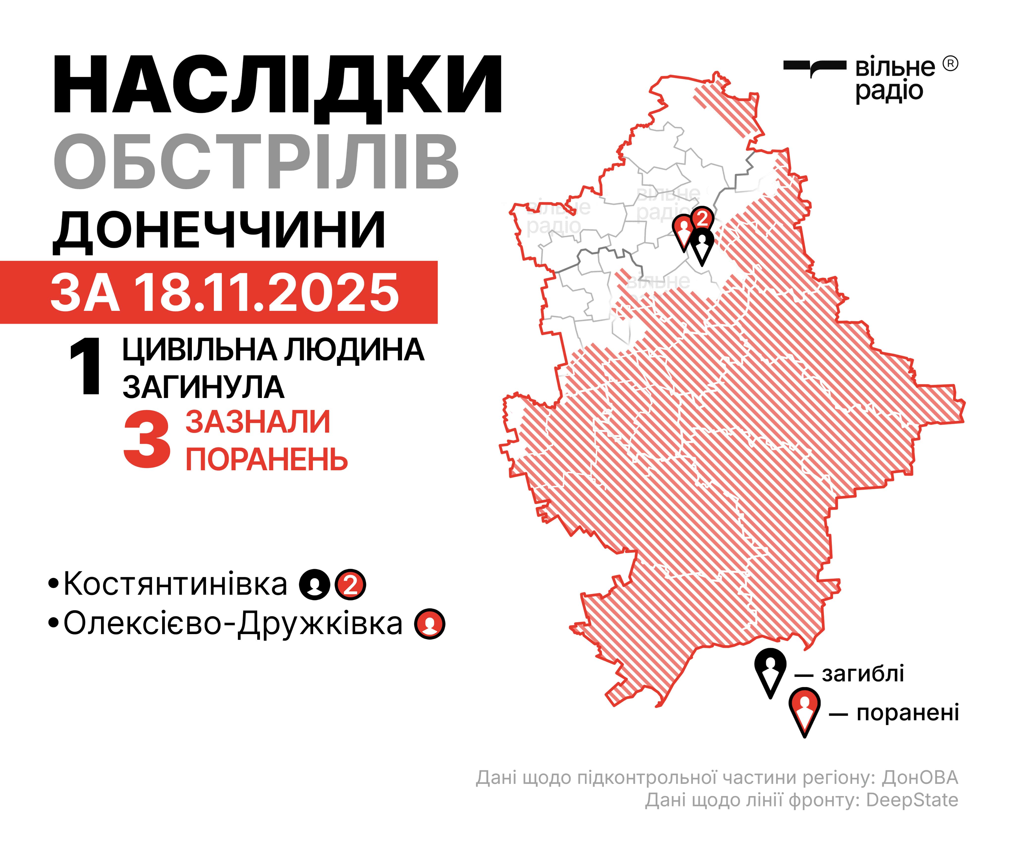 Наслідки російських атак у Донецькій області за 18 листопада 2025 року. Інфографіка: Вільне РадіоНаслідки російських атак у Донецькій області за 18 листопада 2025 року. Фото: поліція ДонеччиниНаслідки російських атак у Донецькій області за 18 листопада 2025 року. Фото: поліція Донеччини