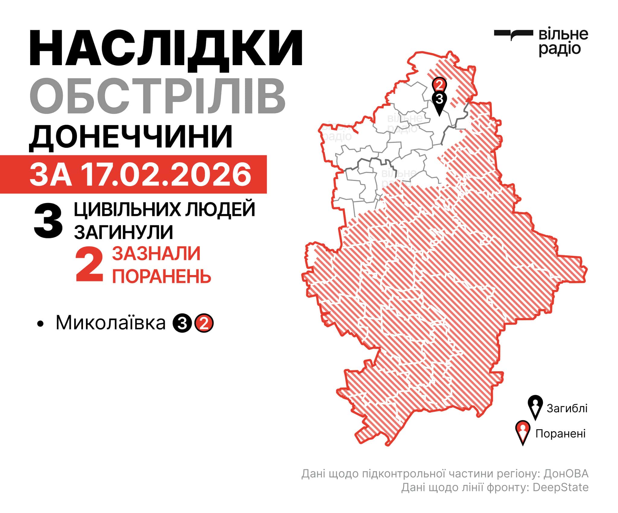 Жертви російських атак на Донеччині за 17 лютого 2026 року. Інфографіка: Вільне РадіоНаслідки російських атак у Донецькій області за 17 лютого 2026 року. Фото: поліція ДонеччиниНаслідки російських атак у Донецькій області за 17 лютого 2026 року. Фото: поліція Донеччини