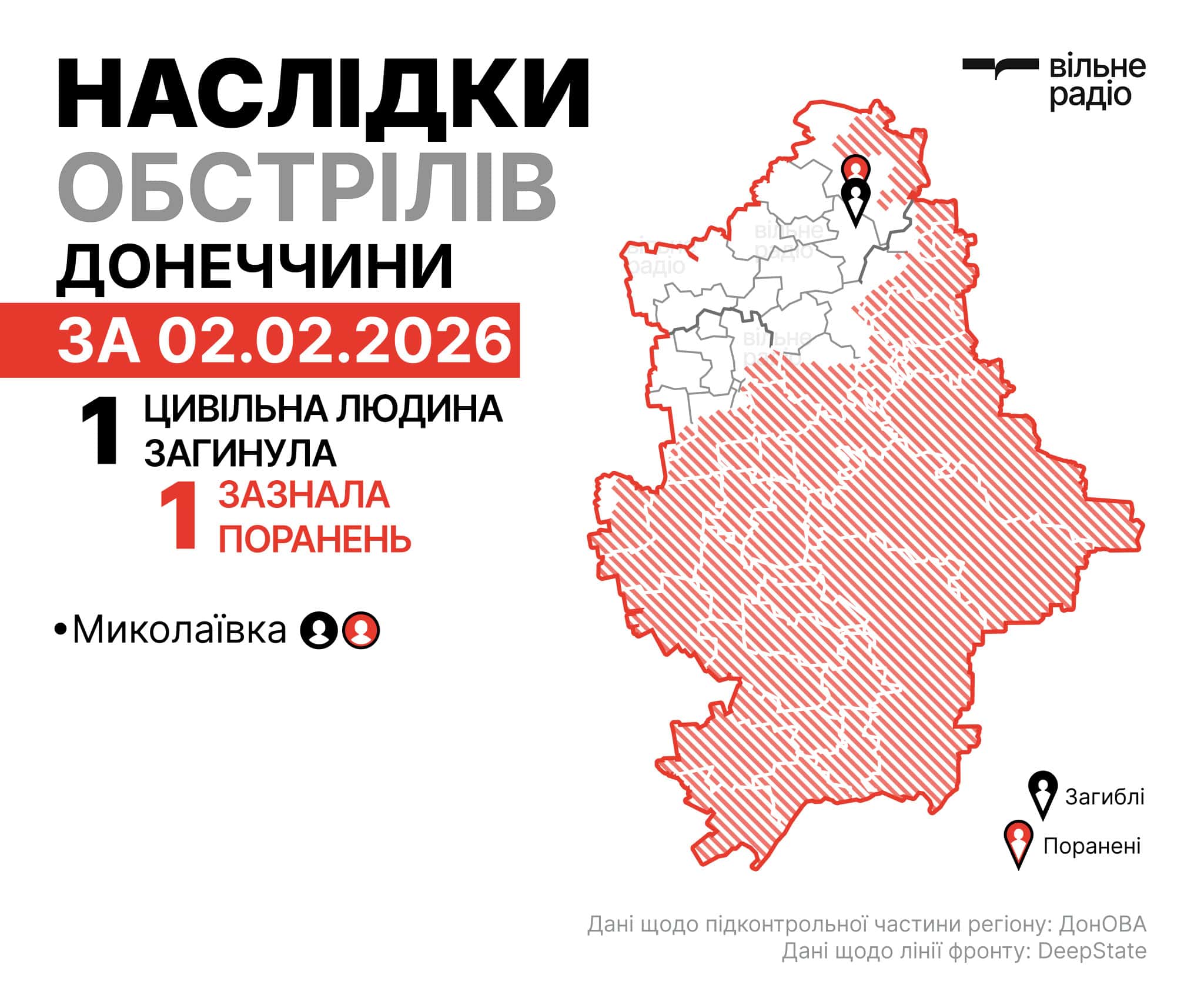 Поліція повідомляє, що під вогнем за добу 2 лютого були 10 населених пунктів регіону: Добропілля, Дружківка, Костянтинівка, Краматорськ, Миколаївка та Слов’янськ, селище Біленьке, села Кіндратівка, Михайлівка та Софіївка.