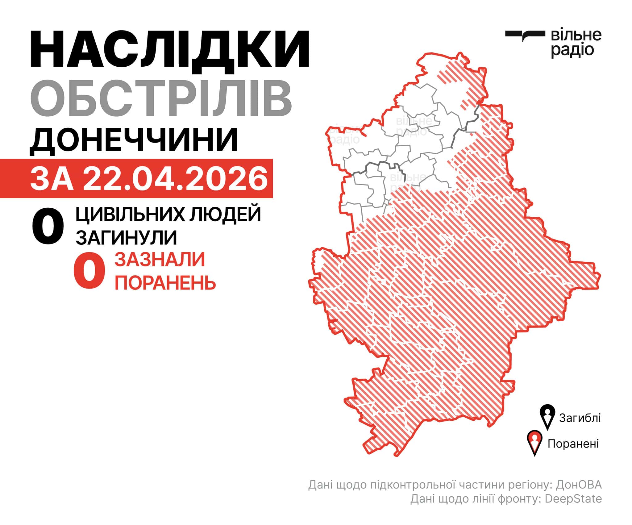 Протягом доби 22 квітня поліція зафіксувала 1245 ударів з боку армії країни-агресорки по підконтрольній частині Донецької області, попередньо, вони не призвели до поранення або загибелі цивільних мешканців, хоч частина атак і була спрямована на житлові квартали регіону. Зранку 23 квітня в регіоні загинула одна цивільна людина.