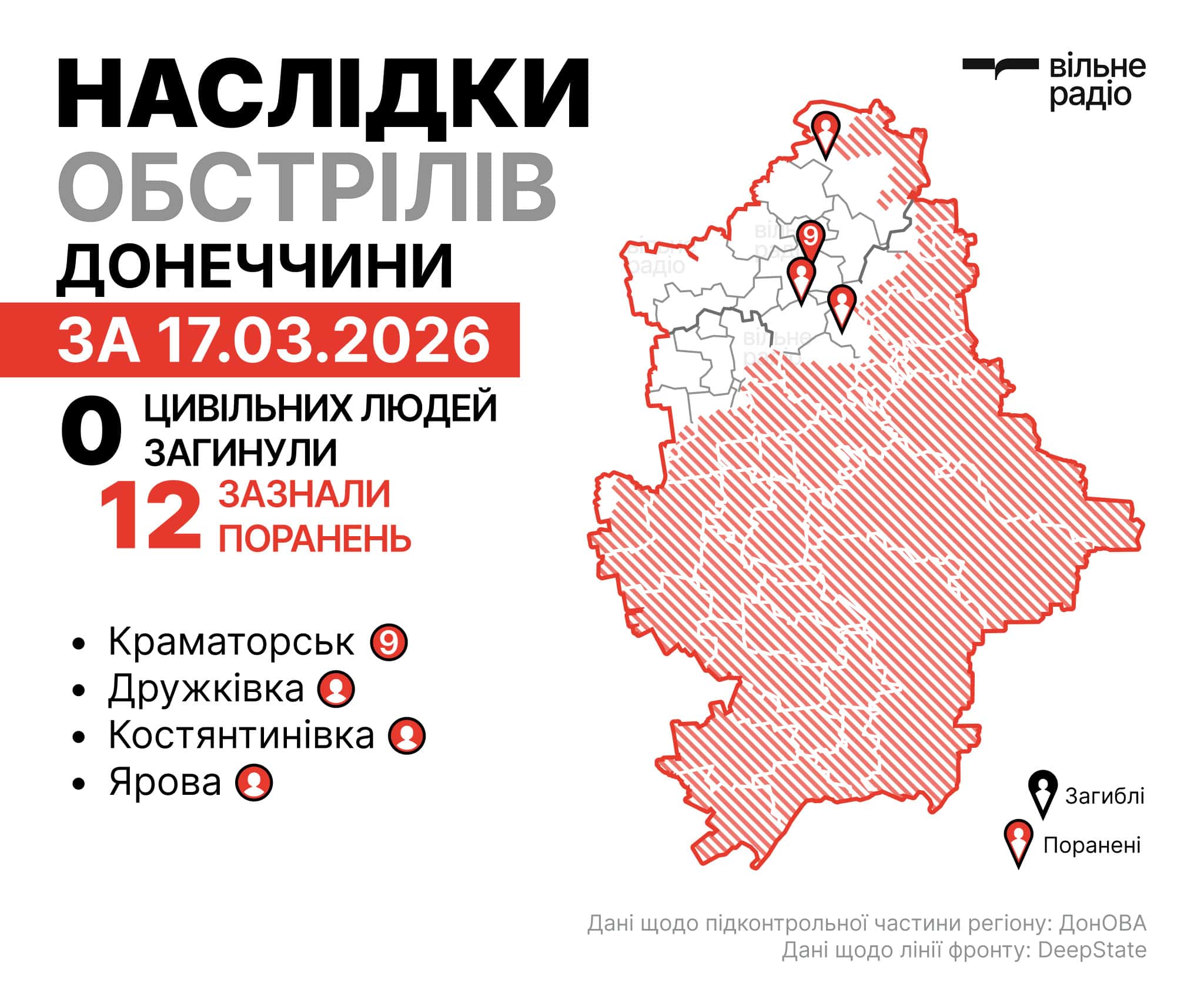 У Костянтинівці внаслідок влучання FPV-дрона є один поранений, пошкоджений приватний будинок. По Краматорську Росія била вдень — поранена одна людина, пошкоджені чотири автомобілі. Одна людина поранена також у Яровій.