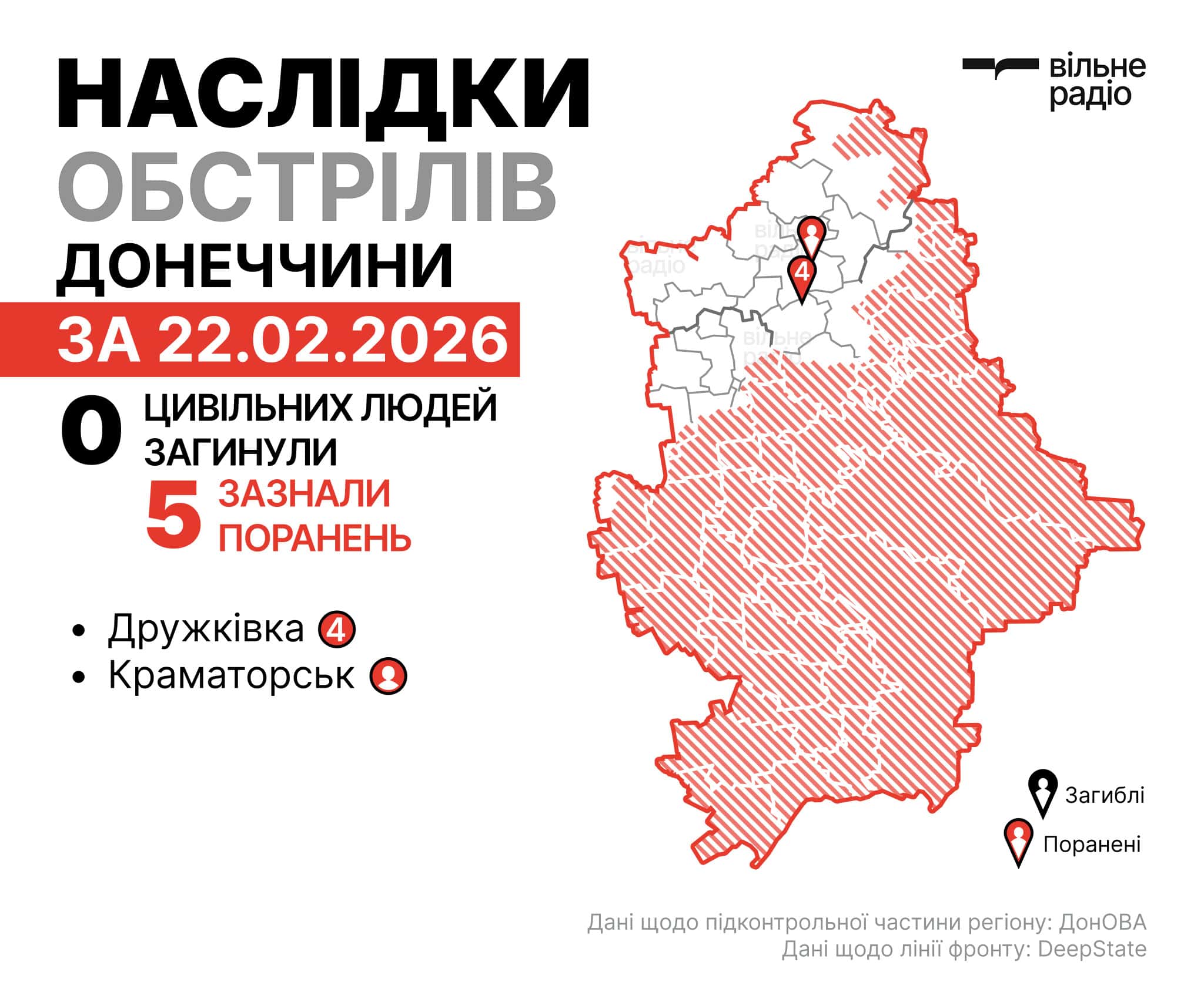 Наслідки російських атак у Донецькій області за 22 лютого 2026 року. Інфографіка: Вільне РадіоНаслідки російських атак у Донецькій області, 22 лютого 2026 року. Фото: ГУНП ДонеччиниНаслідки російських атак у Донецькій області, 22 лютого 2026 року. Фото: ГУНП Донеччини