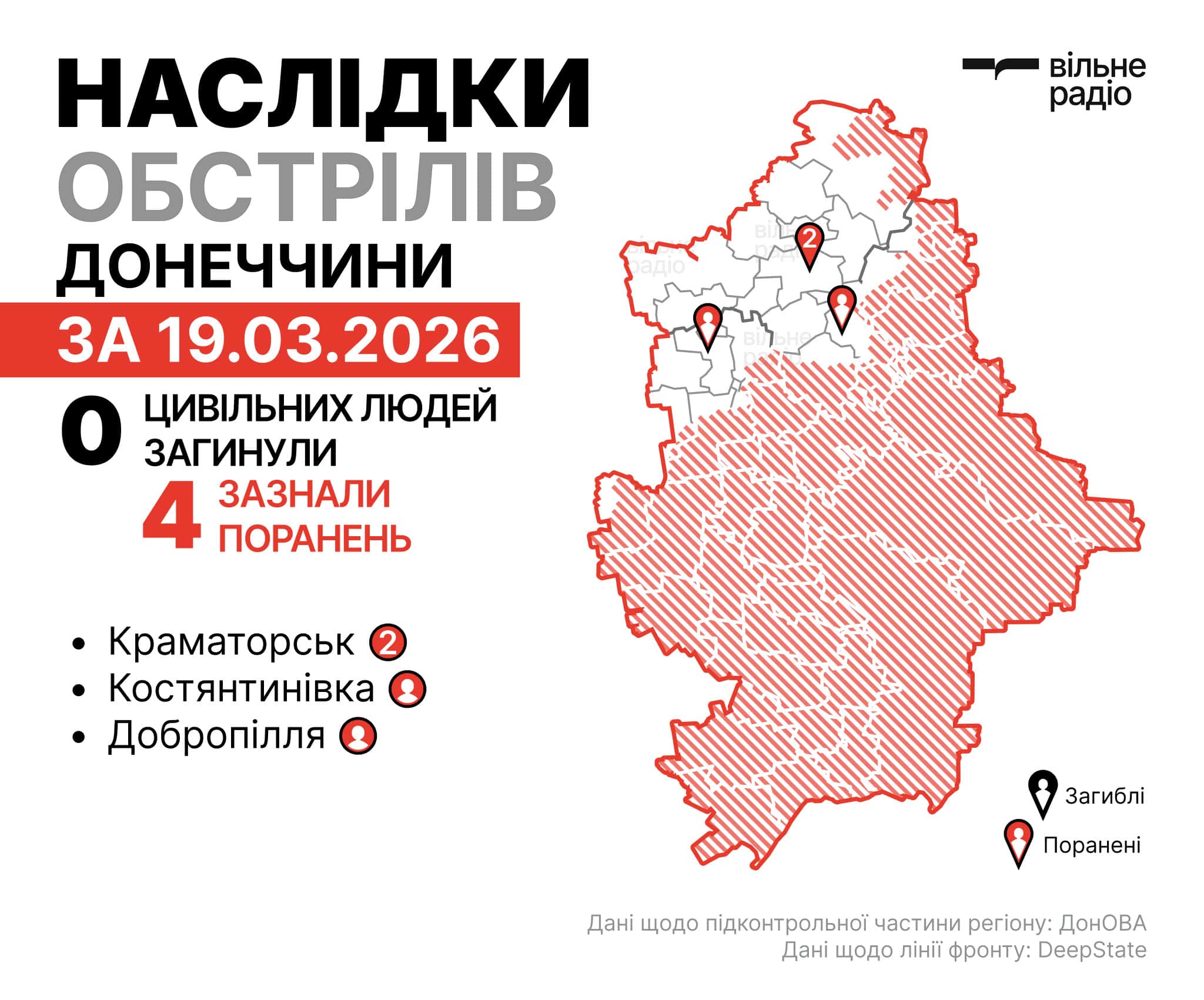 Наслідки обстрілів на Донеччині за 19 березня 2026 року, мапа бойових дій у Донецькій області. Інфографіка: Вільне РадіоНаслідки обстрілів у Донецькій області за 19 березня 2026 року. Фото: поліція ДонеччиниНаслідки обстрілів у Донецькій області за 19 березня 2026 року. Фото: поліція Донеччини