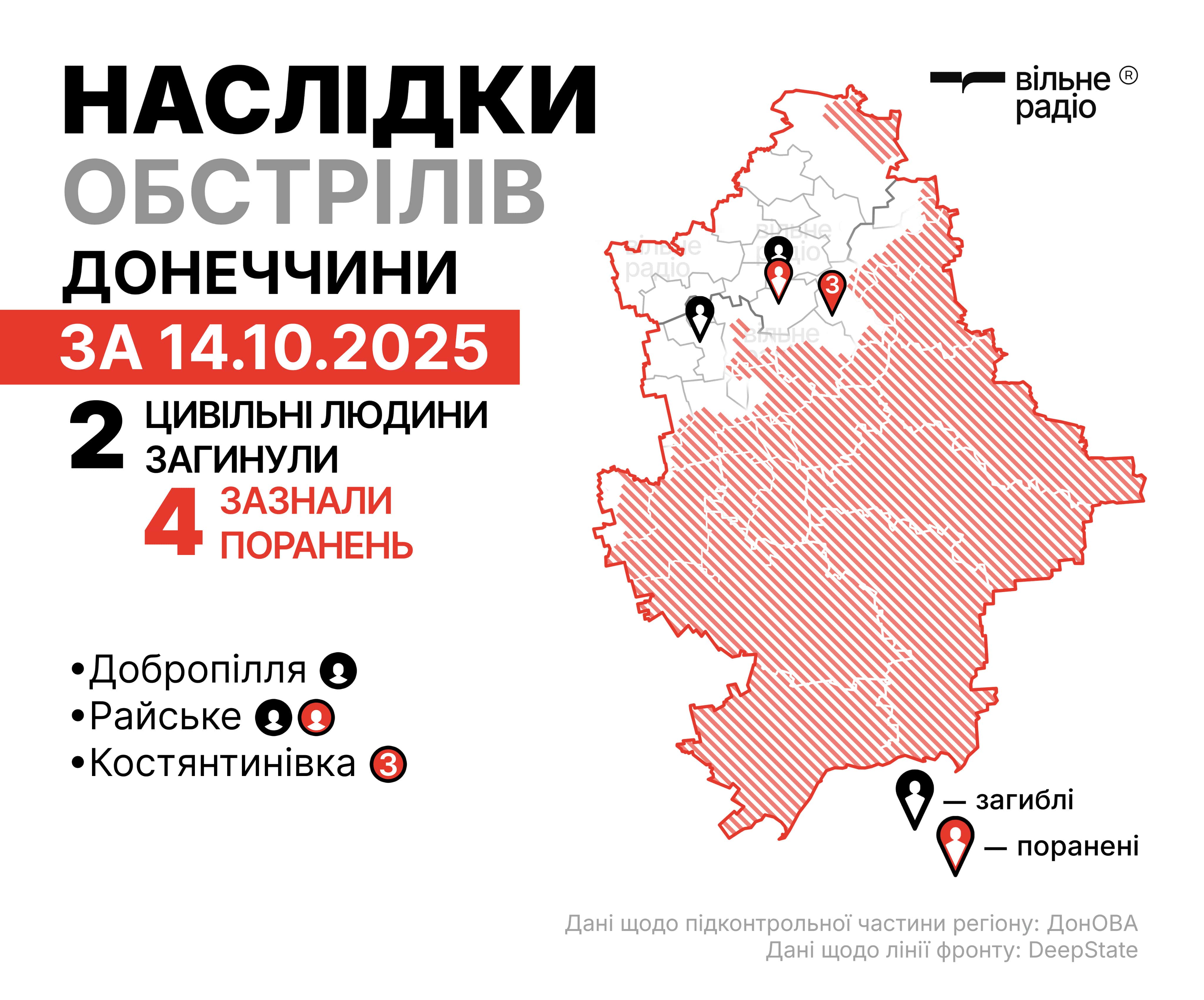 Наслідки російських атак у Донецькій області 14 жовтня 2025 року. Інфографіка: Вільне РадіоНаслідки російських атак у Донецькій області 14 жовтня 2025 року. Фото: поліція ДонеччиниНаслідки російських атак у Донецькій області 14 жовтня 2025 року. Фото: поліція Донеччини