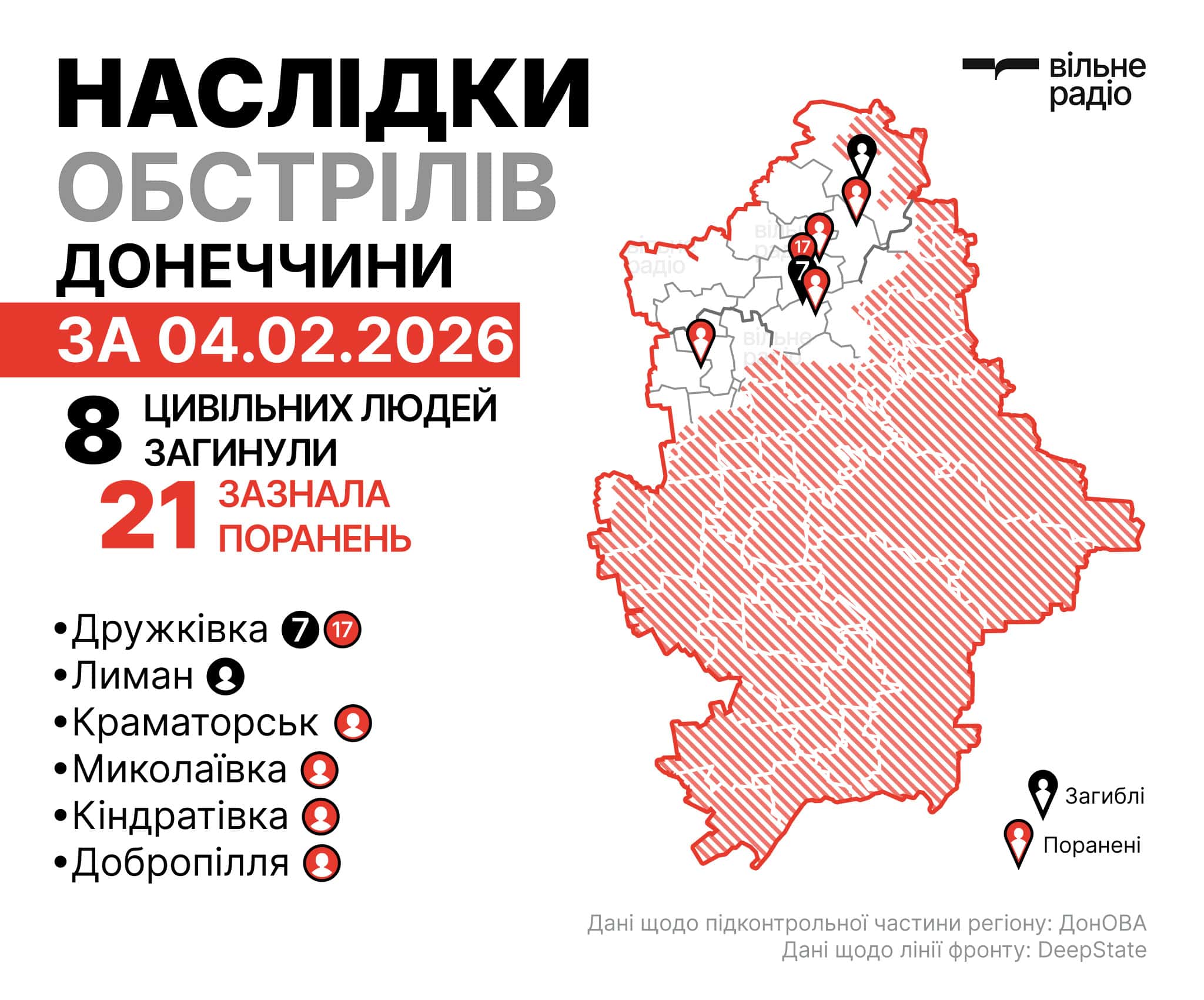 За даними поліції, під вогнем 4 лютого перебували щонайменше дев’ять населених пунктів: міста Дружківка, Краматорськ, Лиман і Миколаївка, селище Райгородок, Олександрівка, села Добропілля, Кіндратівка та Малинівка.